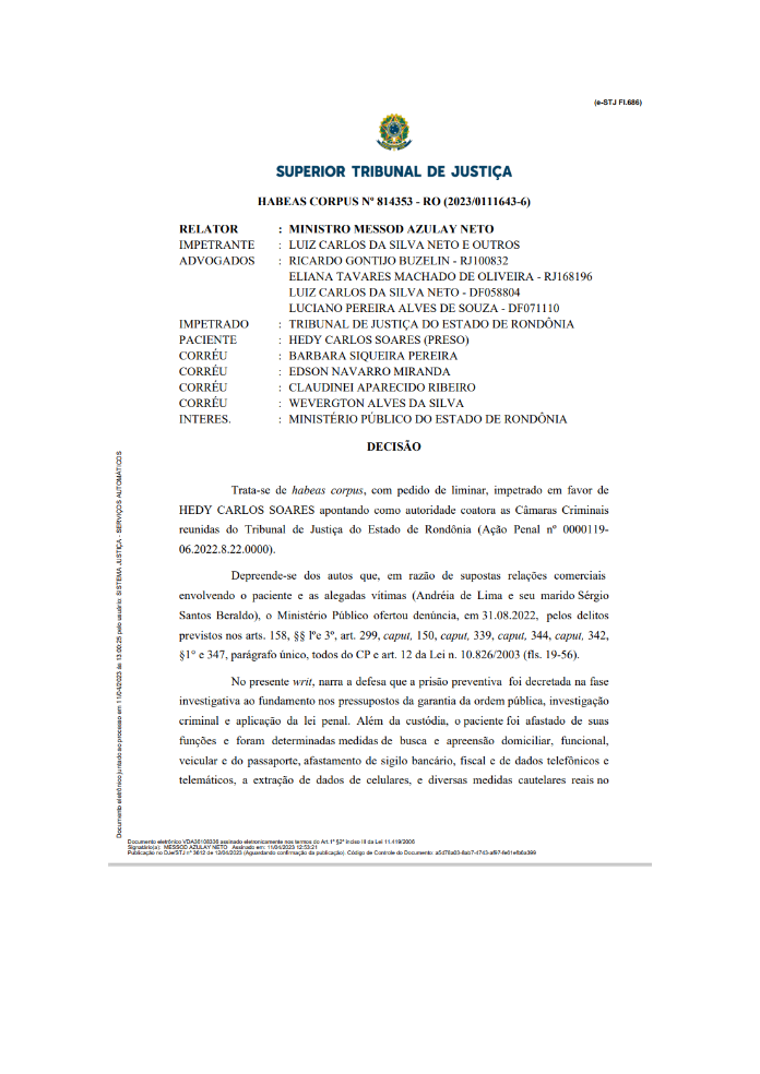 A decisão, prolatada pelo ministro Messod Azulay Neto, saiu na última segunda-feira (10), mas até a noite desta terça-feira ainda não aparecia no site do STJ