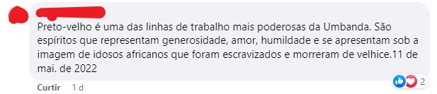 “Uma pena que a ignorância, preconceito ainda cause tanta confusão entre as pessoas”, comentou uma outra cidadã, que ainda publicou um link de pesquisas para as pessoas saberem o que significa o Preto Velho, nas religiões africanas.