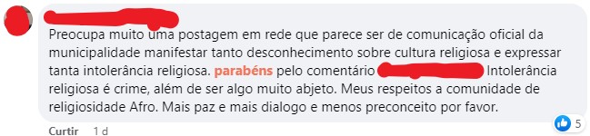 “Preocupa muito uma postagem em rede que parece ser de comunicação oficial da municipalidade manifestar tanto desconhecimento sobre cultura religiosa e expressar tanta intolerância religiosa. Intolerância religiosa é crime, além de ser algo muito abjeto. Meus respeitos a comunidade de religiosidade Afro. Mais paz e mais diálogo e menos preconceito, por favor”, observou um homem.
