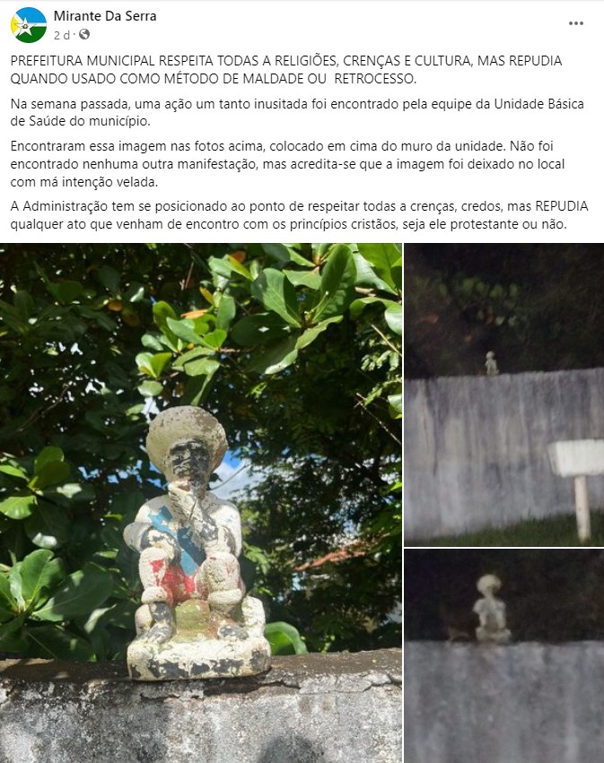 “PREFEITURA MUNICIPAL RESPEITA TODAS A RELIGIÕES, CRENÇAS E CULTURA, MAS REPUDIA QUANDO USADO COMO MÉTODO DE MALDADE OU RETROCESSO. Na semana passada, uma ação um tanto inusitada foi encontrado (sic) pela equipe da Unidade Básica de Saúde do município”.