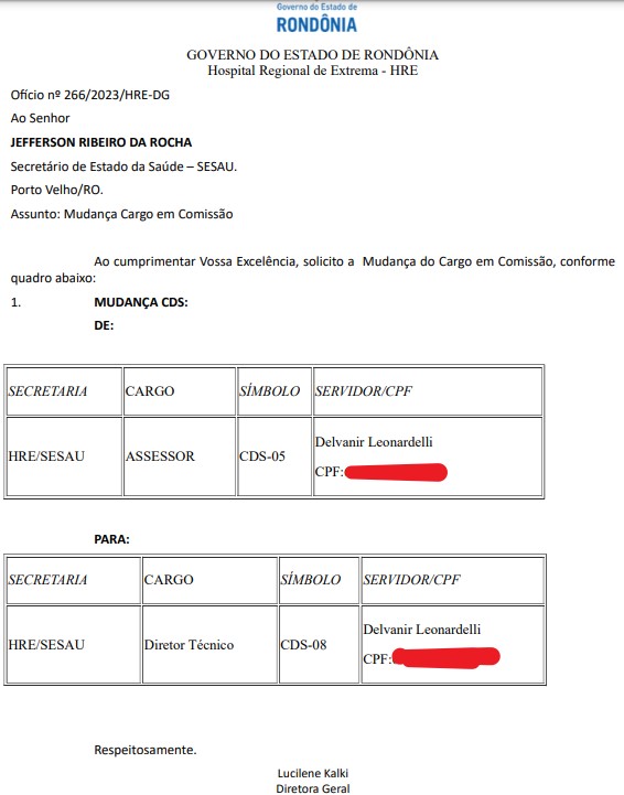 Servidores que estão lotados no Hospital Regional de Extrema (HRE), que fica a mais de 300 quilômetros de Porto Velho, denunciaram um fato inusitado na unidade de saúde: no último dia 05 de junho, a diretora-geral Lucilene Kalki, que segundo eles, é técnica educacional lotada na Seduc (Secretaria Estadual de Educação) pediu a nomeação de Delvanir Leonardelli, que é técnico de informática da Sesau (Secretaria Estadual de Saúde) no cargo de diretor técnico.