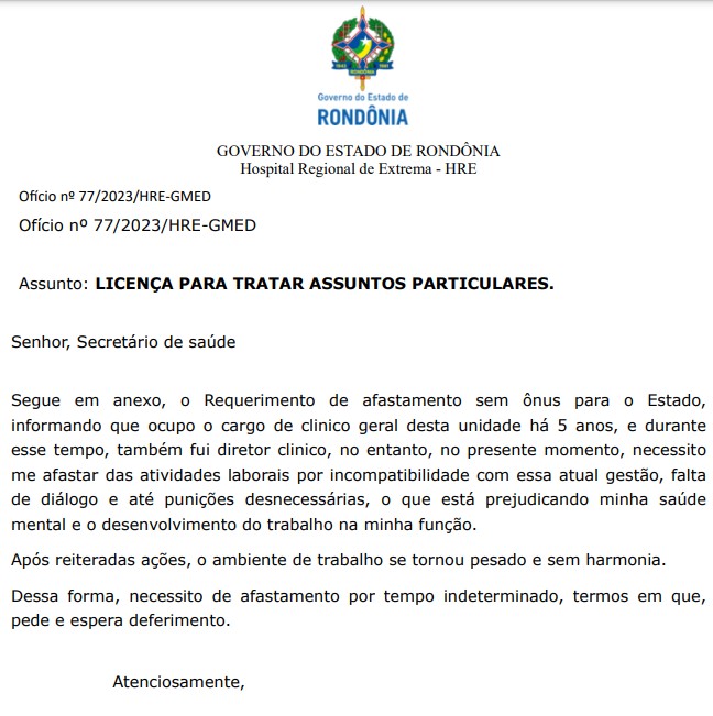 “Ocupo o cargo de clínico-geral desta unidade há 5 anos, e durante esse tempo, também fui diretor clínico, no entanto, no presente momento, necessito me afastar das atividades laborais por incompatibilidade com essa atual gestão, falta de diálogo e até punições desnecessárias, o que está prejudicando minha saúde mental e o desenvolvimento do trabalho na minha função”.