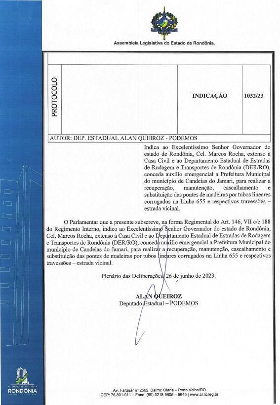 O deputado realizou o pedido ao governador de Rondônia, Cel. Marcos Rocha, para a utilização do auxílio emergencial para a prefeitura municipal de Candeias do Jamari. De acordo com Alan Queiroz, a revitalização das estradas possibilitam a elevação da qualidade de vida e fortifica o crescimento econômico do município.