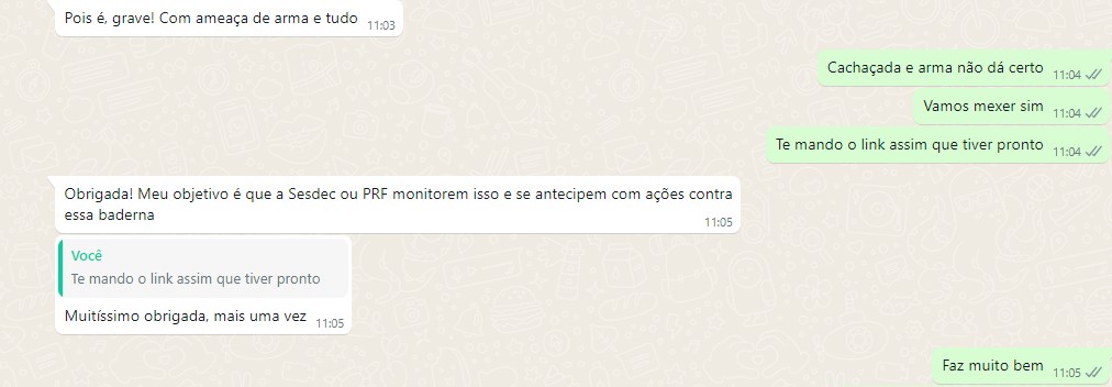 “Esse negócio de cachaçada, começando cedo, com armas e tiros tem tudo para dar errado. Protesto tem que ser pacífico, ainda mais quando envolve supostamente assuntos tão sérios como saúde e segurança. Meu objetivo é que a Sesdec [Secretaria Estadual de Segurança] ou PRF [Polícia Rodoviária Federal] monitorem isso e se antecipem com ações contra essa baderna”, destacou ela.