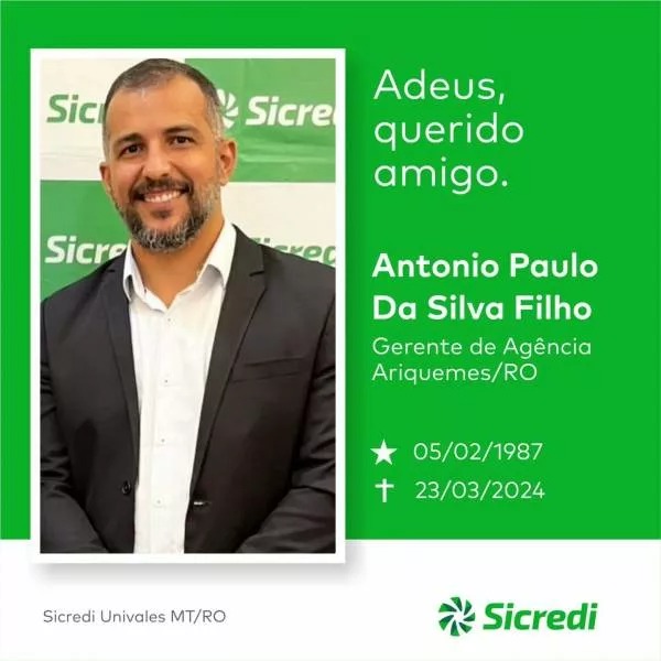A cidade de Ariquemes está de luto após a confirmação da morte de Antônio Paulo da Silva Filho, gerente da agência local do Sicredi. Antônio, que completou 37 anos no mês passado, estava desaparecido desde ontem após um acidente de barco no rio Canaã.