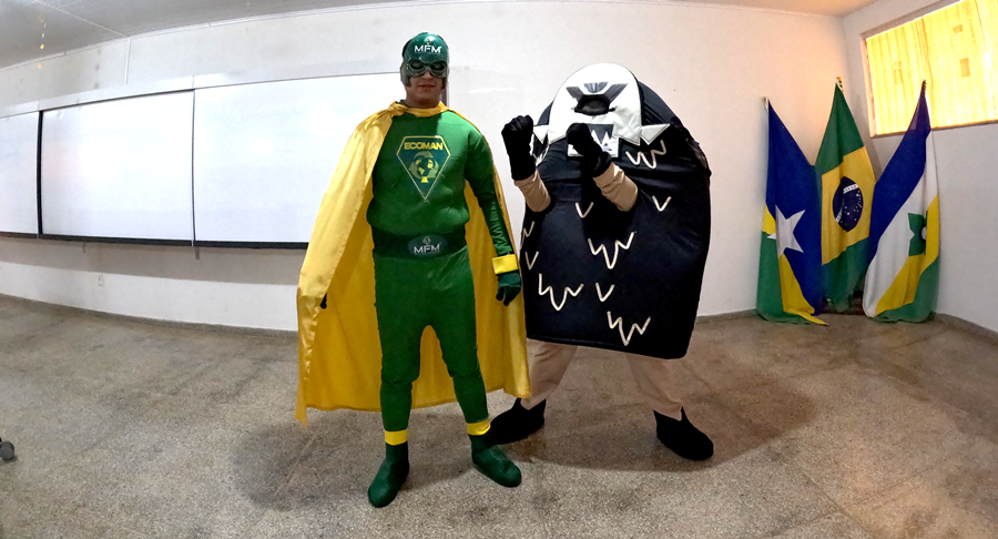 Um dos momentos mais esperados da palestra foi a presença de EcoMan e ChoruMan, personagens criados pela MFM Soluções Ambientais para simbolizar a luta entre práticas ambientais sustentáveis e comportamentos prejudiciais ao meio ambiente. A dinâmica entre o herói e o vilão serviu para ilustrar de forma clara e divertida como cada ação individual pode impactar nosso planeta.