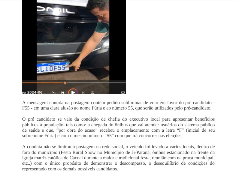 Os detalhes dados pelo MPE no processo indicam: “O pré-candidato se vale da condição de chefia do executivo local para apresentar benefícios públicos à população, tais como: a chegada do ônibus que vai atender usuários do sistema público de saúde e que, ‘por obra do acaso’ recebeu o emplacamento com a letra ‘F’ (inicial de seu sobrenome Fúria) e com o mesmo número ‘55’ com que irá concorrer nas eleições”.