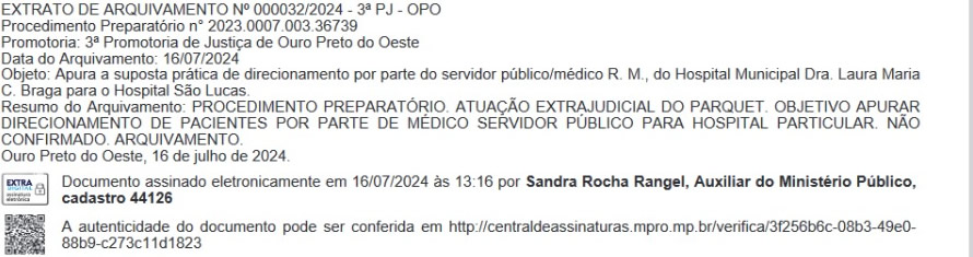O Ministério Público do Estado de Rondônia – MP/RO, por meio da 3ª Promotoria de Justiça da Comarca de Justiça de Ouro Preto do Oeste, arquivou denúncia contra um profissional médico da especialidade de ortopedia que atende no Hospital Municipal Dra. Laura Maria Braga do município de Ouro Preto do Oeste. A denúncia com viés político aportada no MP/RO, informava que o médico ortopedista e traumatologista Dr. Rodrigo Mezzomo, que atende no HM, estava direcionando pacientes para serem atendidos no Hospital particular São Lucas localizado na área central de Ouro Preto do Oeste. Tal denuncia classificada como “fake news”, não foi comprovada após o trabalho investigativo responsável e isento por parte do MP/RO que analisou documentos e ouviu pessoas e ao final atestou a responsabilidade do médico Rodrigo Mezzomo em atuar no serviço público de saúde com conduta ilibada e humanizada no trato com os outros profissionais de saúde e os pacientes e seus familiares.