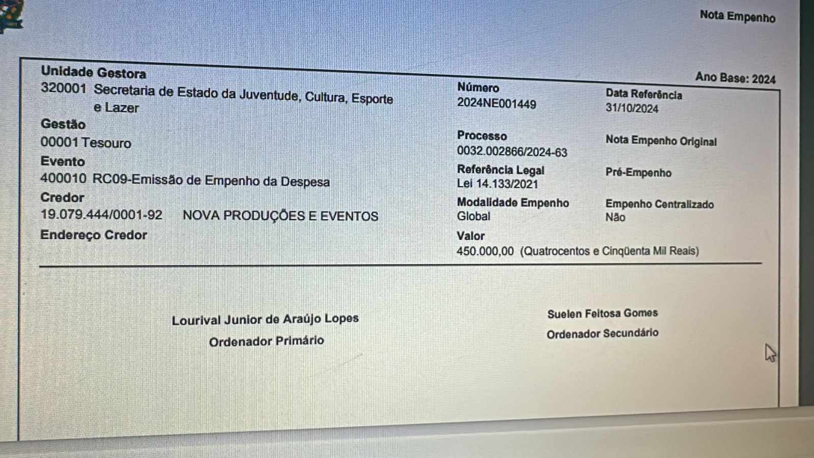 Alvo de uma investigação impetrada pelo Ministério Público de Rondônia - MP/RO, que culminou com uma denúncia de improbidade, o secretário de esporte e cultura de Rondônia, Júnior Lopes, assinou a Nota de Empenho que irá utilizar R$ 940 mil do dinheiro do povo de Rondônia para arcar com os shows da dupla Thaeme e Thiago e do cantor Mano Walter.