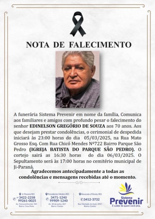 Morreu no decorrer da tarde desta quarta-feira (5/2/25), Edinelson Gregório de Souza, que era popularmente conhecido por “Edinelson Piloto” de aeronaves, tinha 70 anos e estava internado há nove dias em uma Unidade de Tratamento Intensivo (UTI) particular de Ji-Paraná.
