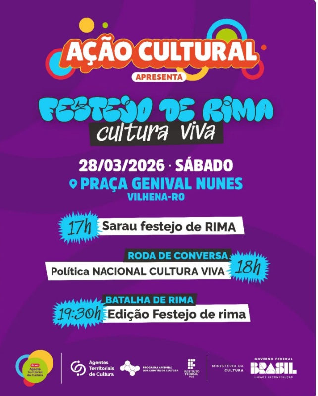 O município de Vilhena recebe no próximo dia 28 de março de 2026 o evento cultural “Festejo de Rima – Cultura Viva”, com programação gratuita voltada à cultura urbana. As atividades começam a partir das 17h, na Praça Genival Nunes, no bairro Jardim Eldorado.