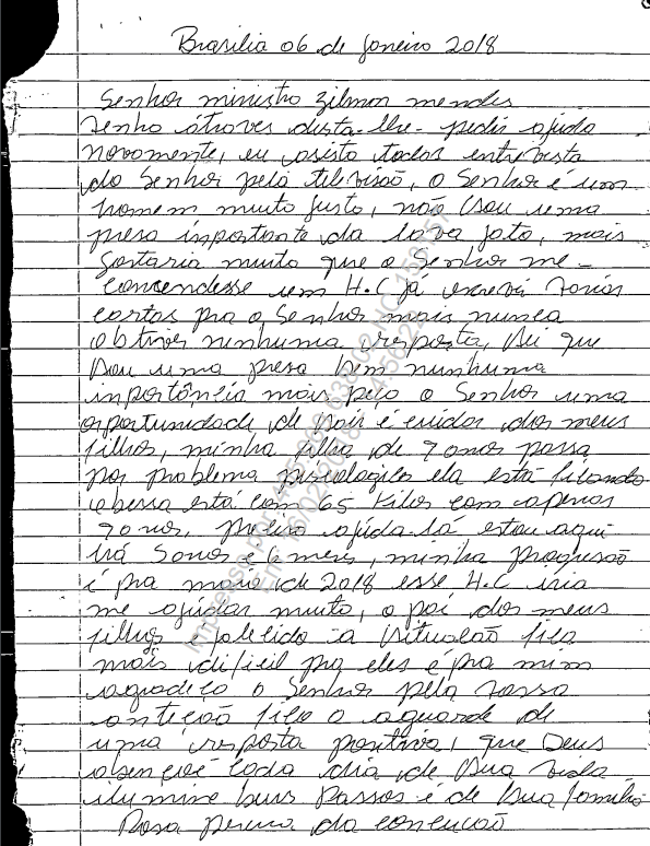 A carta, redigida de próprio punho em uma folha de caderno, chegou ao Supremo no dia 10 deste mês. A mensagem, que partiu da Cela 4, Bloco III, Ala C do presídio feminino de Brasília, foi enviada em 6 de janeiro. Uma correspondência anterior de Rosa Maria, com o mesmo pedido ao ministro, é datada de agosto do ano passado.