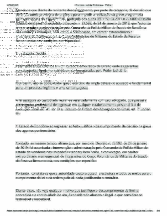 Também fora informado à Justiça que, na Casa de Detenção de Vilhena, o diretor, em resposta a determinado ofício encaminhado pela Comissão de Defesa das Prerrogativas da OAB/RO, noticiou a insuficiência de contingente de agentes penitenciários em razão da “Operação Padrão”, deflagrada pelo Singeperon, solicitando que a Comissão informasse aos advogados que o atendimento ocorreria das 07h30 às 13h30.