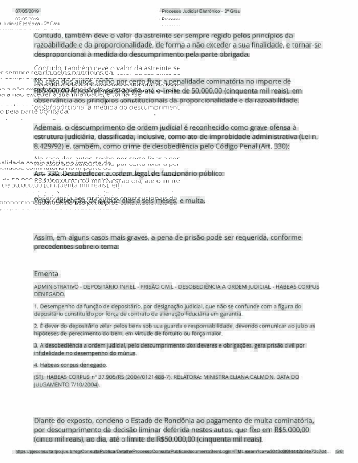 “Diante do exposto, condeno o Estado de Rondônia ao pagamento de multa cominatória, por descumprimento da decisão liminar deferida nestes autos, que fixo em R$5.000,00 (cinco mil reais), ao dia, até o limite de R$50.000,00 (cinquenta mil reais)”, arrematou Marques.