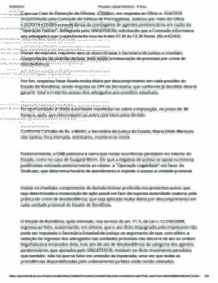 Citou como exemplo a Casa de Detenção Masculina de Guajará-Mirim, onde, segundo a OAB/RO, um advogado teria sido impedido pelo diretor da instituição carcerária de colher assinatura de seu cliente na procuração, pois, segundo fora informado, havia sido deflagrada a operação “Legalidade” em favor do Singeperon. Por conta disso, deveria retornar outro dia para atendimento de 08h às 13h, não podendo naquele momento ingressar na unidade prisional.