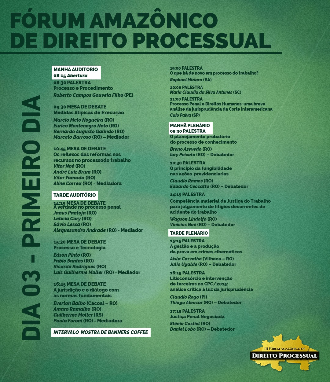 O Fórum Amazônico de Direito Processual teve a sua primeira edição no ano de 2016, o mesmo ano em que o novo ordenamento processual civil entrou em vigor, demonstrando a necessidade de avanços no estudo da seara processual.