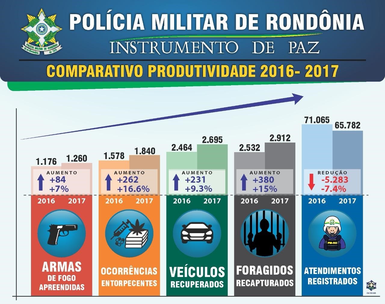 Pela estratégia do Comandante, se aumentar as apreensões de armas de fogo ilegais, aumentar a apreensão de drogas, aumentar a prisão dos foragidos da justiça, e aumentar a recuperação dos veículos roubados ou furtados, certamente, haverá uma redução das ocorrências criminais, pois na maioria dos crimes praticados tem pelo menos um desses fatores envolvidos. Esta tese foi confirmada em 2017, quando todos os indicadores preventivos superaram 2016, e em conseqüência ocorreu uma redução da criminalidade no Estado de Rondônia, na ordem de 7,4%, o que representa uma redução de 5.283 ocorrências policiais a menos, vejamos o gráfico: