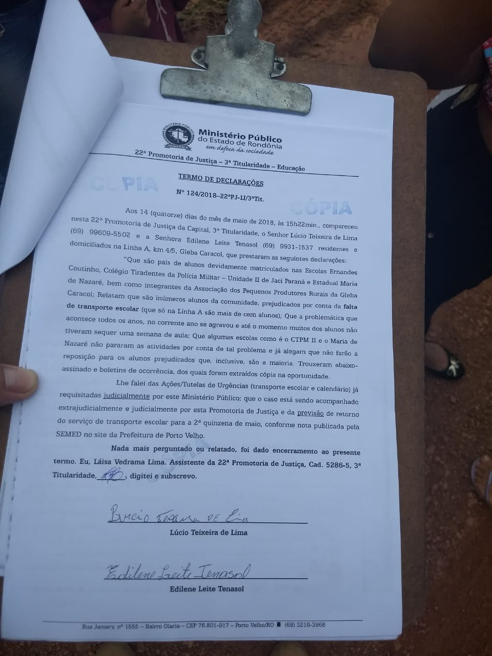 Segundo informações da Polícia Rodoviária Federal, o pleito foi analisado pelo Ministério Público, que teria firmado compromisso para solucionar a demanda, em 72 horas. Foi apresentado um documento, em papel timbrado do Ministério Público Estadual, no qual registra-se a oitiva das partes. Não foi encontrado o registro documental do compromisso de soluções.