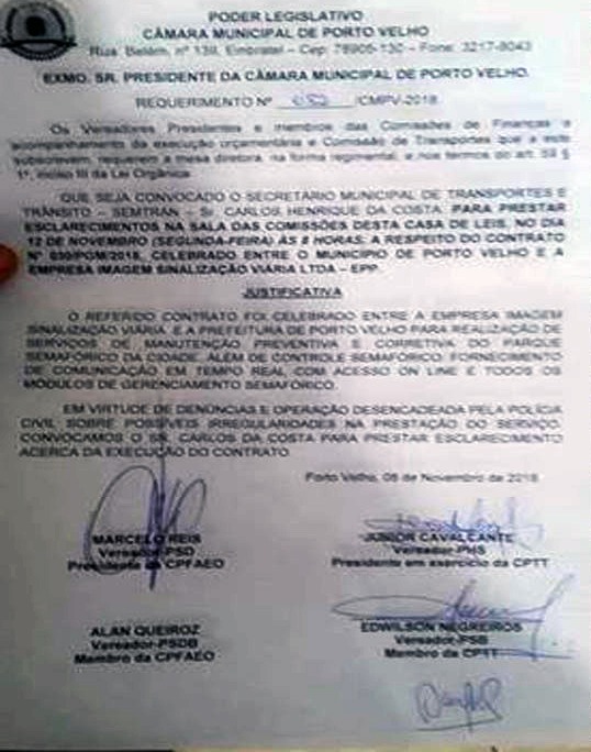 Carlos Henrique, terá que explicar as irregularidades encontradas pela investigação aos representantes das duas comissões, no dia 12 de novembro (segunda-feira) às 08h00. O contrato em discussão é o de nº 030/PGM/2018 firmado entre a prefeitura de Porto Velho e a empresa Imagem Sinalização Viária Ltda -EPP.