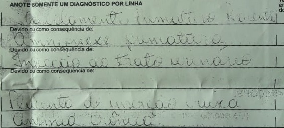 A certidão de óbito emitida pelo Instituto Médico Legal (IML). Apresenta cinco causas da morte da criança. Baseado em fontes da internet listamos uma a uma: