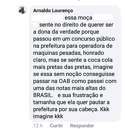 Em apenas um pequeno trecho de debate, “Buiu” ainda faz declarações de menosprezo à vítima como no trecho: “imagine se essa sem noção conseguisse passar na OAB como passei com uma das notas mais altas do BRASIL” (escrita em caixa alta) e que ela “se esconde atrás de uma CIPA” e “sabotadora da administração municipal”.