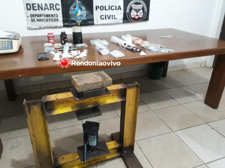 O suspeito foi flagrado com várias porções grandes de cocaína, uma considerável quantia em dinheiro e até mesmo um equipamento que seria usado para prensar entorpecentes para ser embalado em tablete.