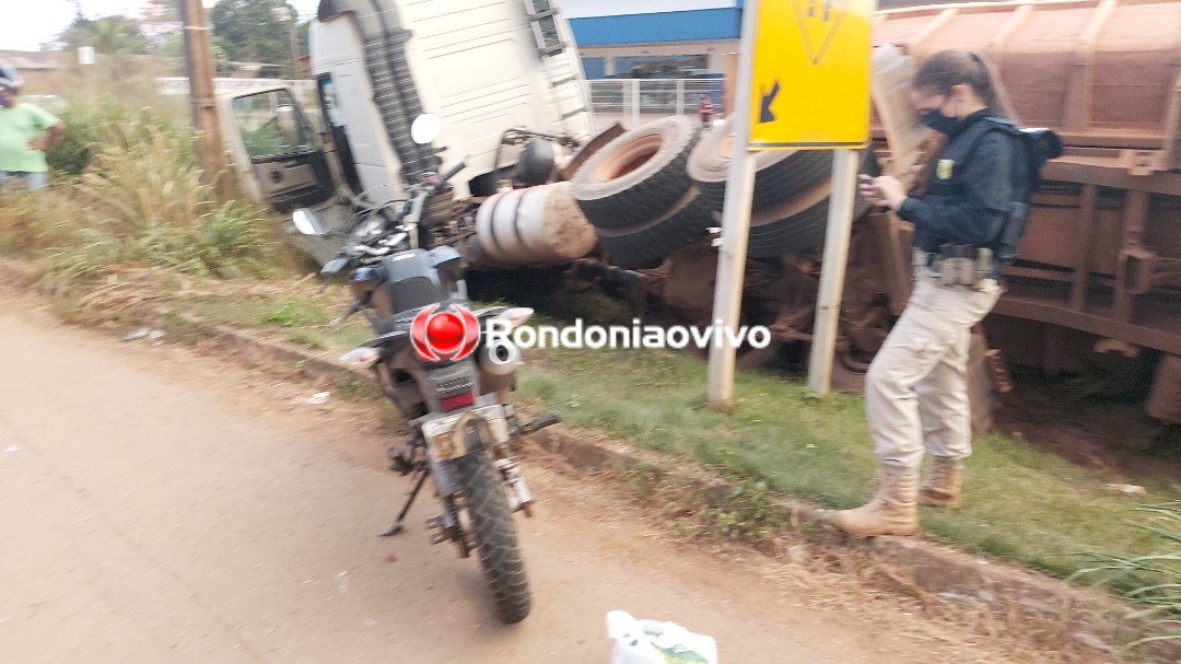 O motorista do pesado veículo puxou a direção para a rua da Beira e tombou com o intuito de não esmagar o casal na moto. Por muita sorte o condutor da moto não teve lesões graves e a esposa dele conseguiu se levantar com leves escoriações.