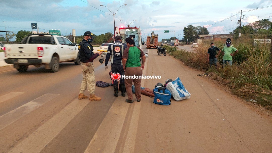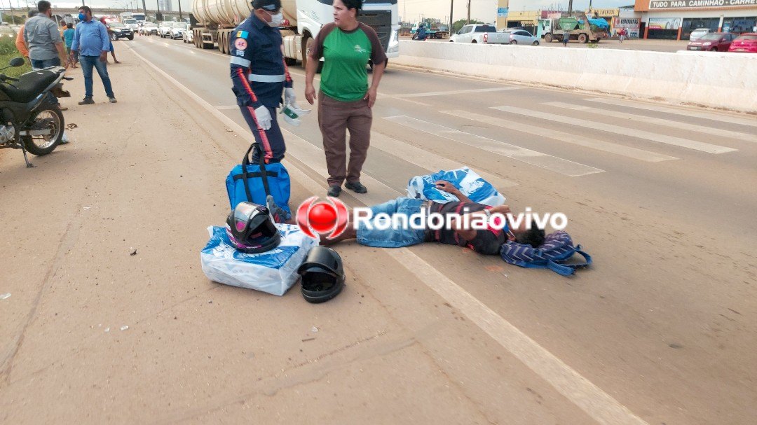 Um casal escapou da morte no final da tarde de terça-feira (30) em um acidente envolvendo moto e uma caçamba trucada na BR-364, próximo a Rua Três e Meio, trecho urbano de Porto Velho (RO).