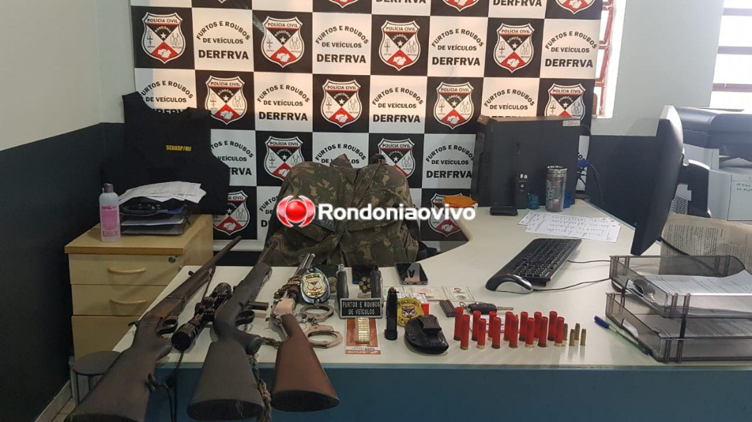 A Polícia Civil de Rondônia, através da Delegacia Especializada em Repressão à Furtos e Roubos de Veículos Automotores, por seus agentes policiais investigadores e cumprindo determinação do delegado titular Alessandro Morey, após diligências investigatórias em uma possível área de desmanche de veículos subtraídos na região rural da BR-319, quilômetro 33, depois da ponte sobre o rio Madeira, em Porto Velho (RO), prenderam Luan R. L., 24, Edilson M., 50, e Ademilson D. M., 44, pelos crimes de posse ilegal de armas de fogo, ameaças, invasão de terras e crimes ambientais.