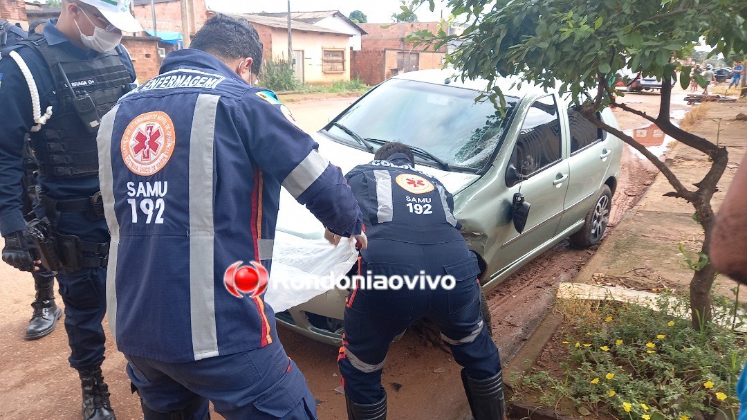Momento em que a equipe do Samu retira a perna da vítima que ficou presa no farol do carro | Foto: Richard Nunes/Rondoniaovivo