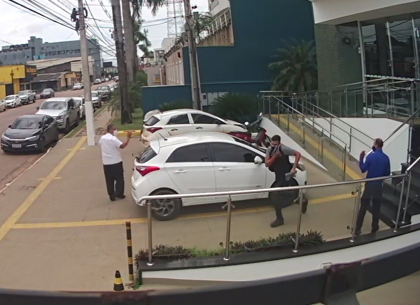 O roubo praticado por dois bandidos em frente a agência do Banco Sicoob foi gravado por câmeras de monitoramento no final da manhã desta segunda-feira (08) na Avenida Calama, região Central de Porto Velho (RO).