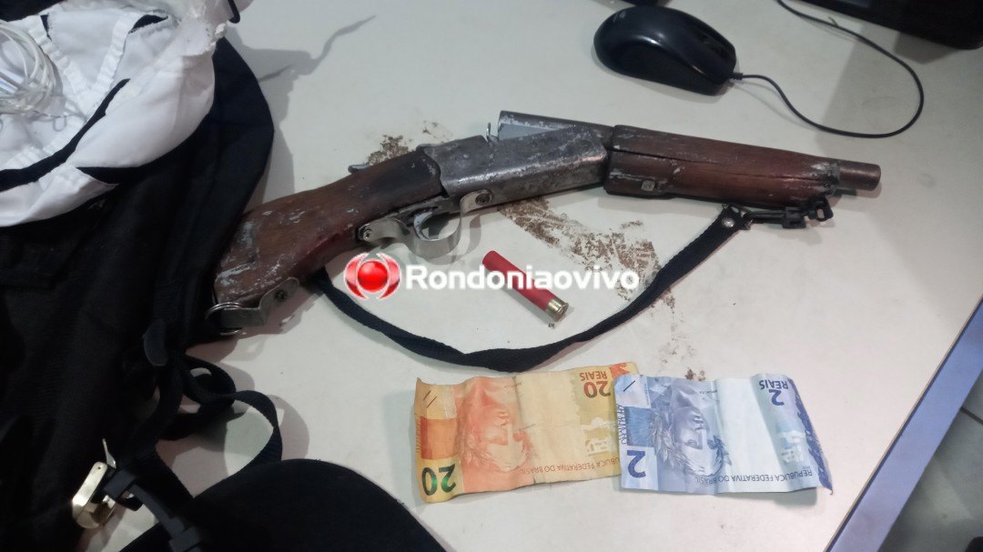 O trio em atitude suspeita foi abordado pelos policiais e na revista foi encontrada em uma mochila uma arma de fabricação caseira, tipo escopeta, calibre 36 com uma munição.