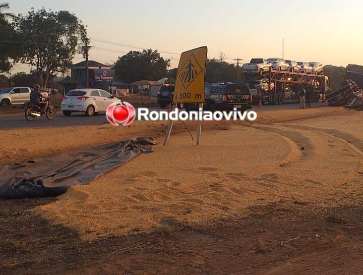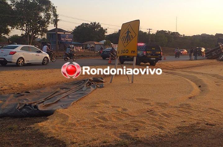 Parte da carga de uma carreta tombou as margens da rodovia e por sorte não houve feridos