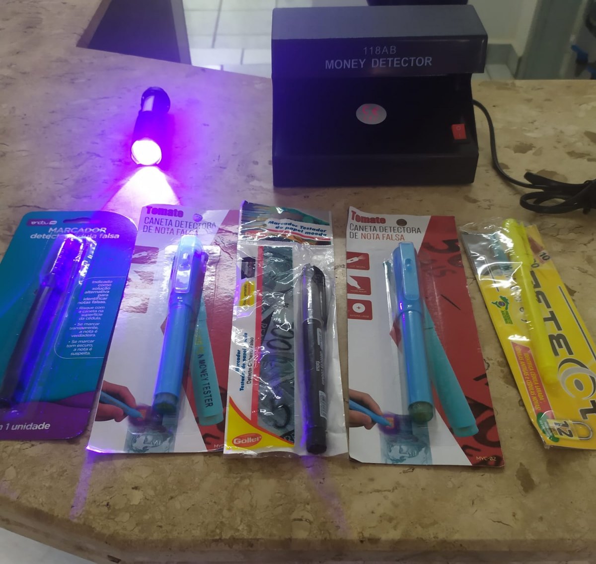 Na casa do preso também foram encontrados diversos itens usados para a avaliação da eficiência desses procedimentos, tais como canetas testes, lanterna de luz ultravioleta e máquina detectora de cédula falsa.