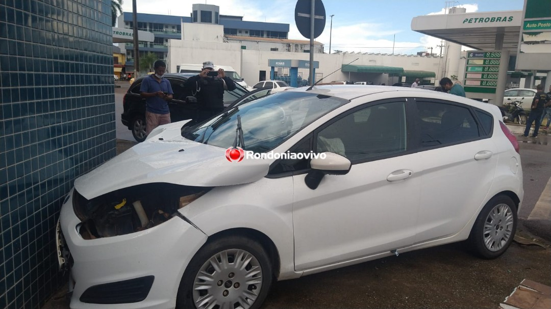 Devido a batida, o carro Fiesta ainda se chocou contra a parede de um estabelecimento comercial e o Strada em um carro parado.
