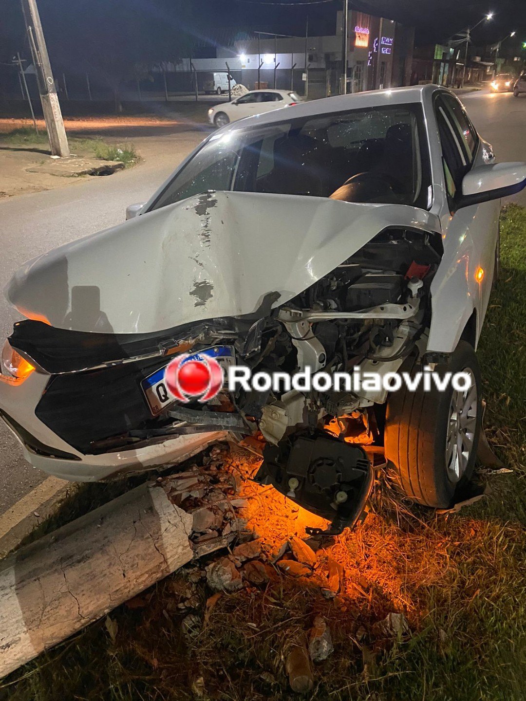 Um carro modelo Onix desgovernado subiu o canteiro central e destruiu um poste de iluminação pública.