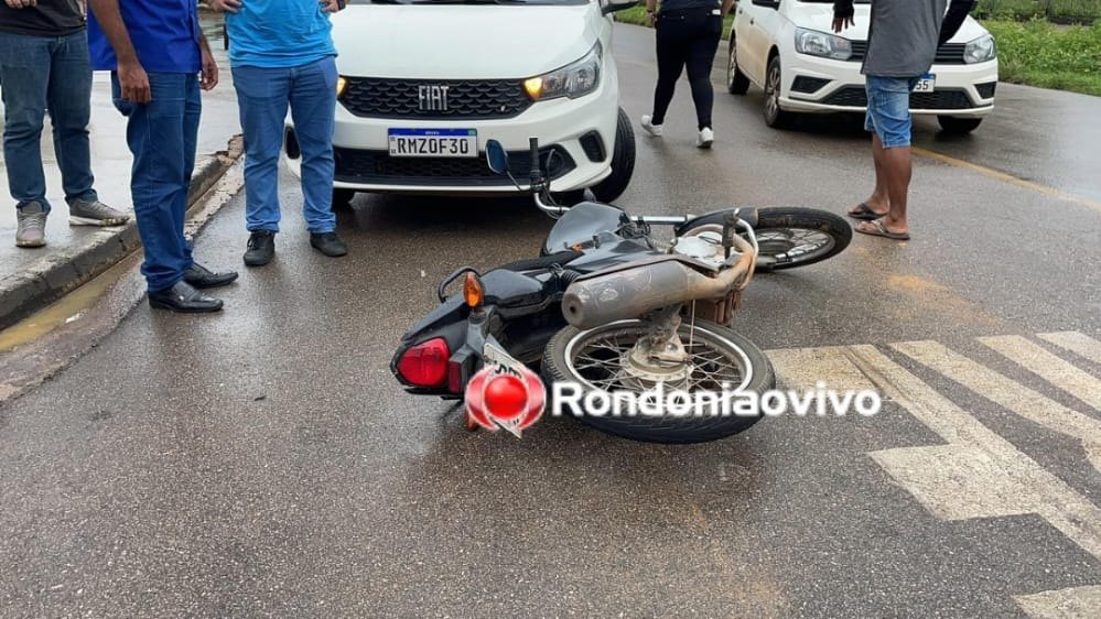 Uma motociclista ficou ferida após ser atropelada por um carro no cruzamento da Avenida Calama com Rua Buenos Aires, bairro Embratel.
