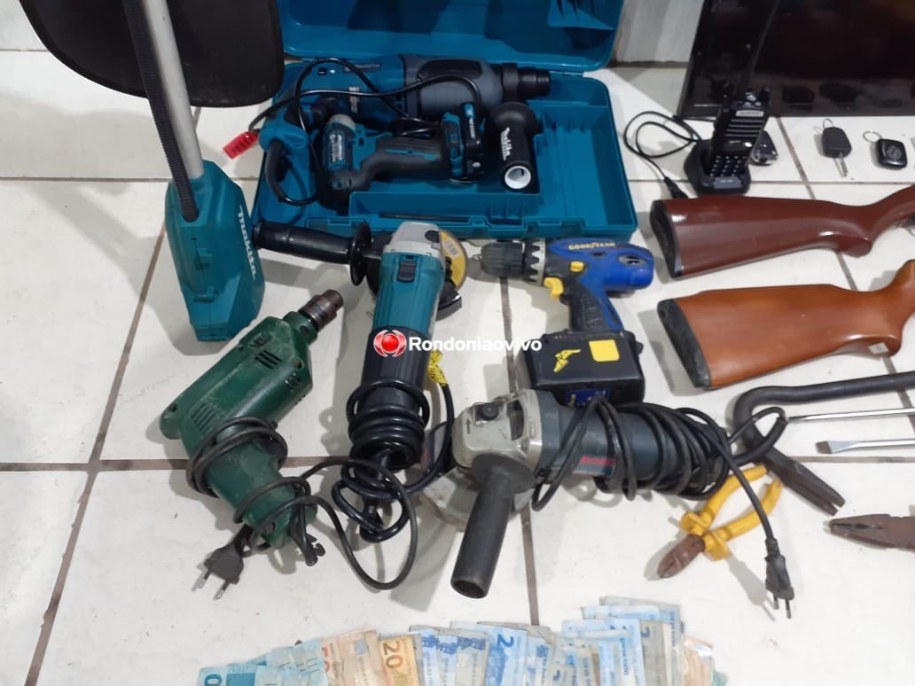Na residência, os policiais encontraram um rifle calibre 22 com 44 munições, uma espingarda de pressão, 95 maços de cigarro, um rádio HT, dinheiro e várias ferramentas, TV, joias de procedência duvidosa.