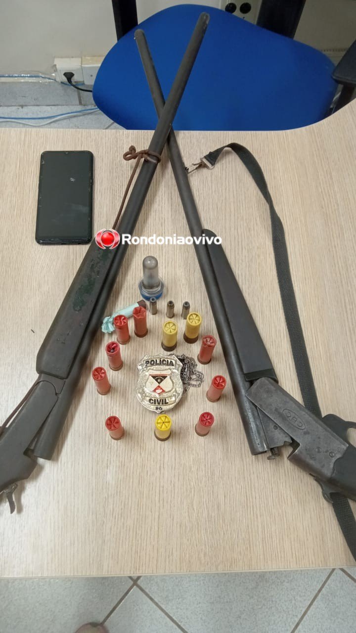 Durante diligência para instruir o inquérito policial nº032/2022, homicídio registrado no dia (01/09/2022), tendo a vítima sido identificada como sendo Charles Matias dos Santos, localizou no Ramal Linha 101, Km 40, perímetro rural, em União Bandeiras, Distrito do município de Porto Velho (RO), o suspeito de ter praticado o referido crime, identificado como Leandro Souza Serafim, com a posse ilegal de munições do cal. 38, duas espingardas e munições do calibre 20 e 28. Diante do exposto, recebeu voz de prisão e foi conduzido até a Central de Flagrantes para a promoção dos procedimentos legais.