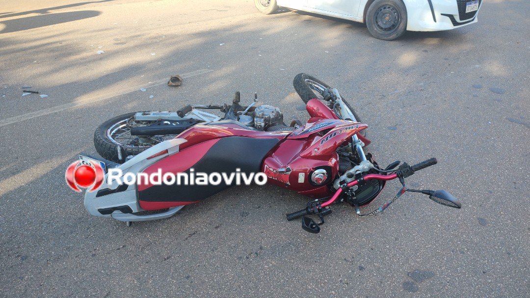 Dois ocupantes de uma motocicleta ficaram bastante machucados após colisão no cruzamento da Avenida Amazonas com Rua Guanabara, bairro Nossa Senhora das Graças, na região Central de Porto Velho (RO).