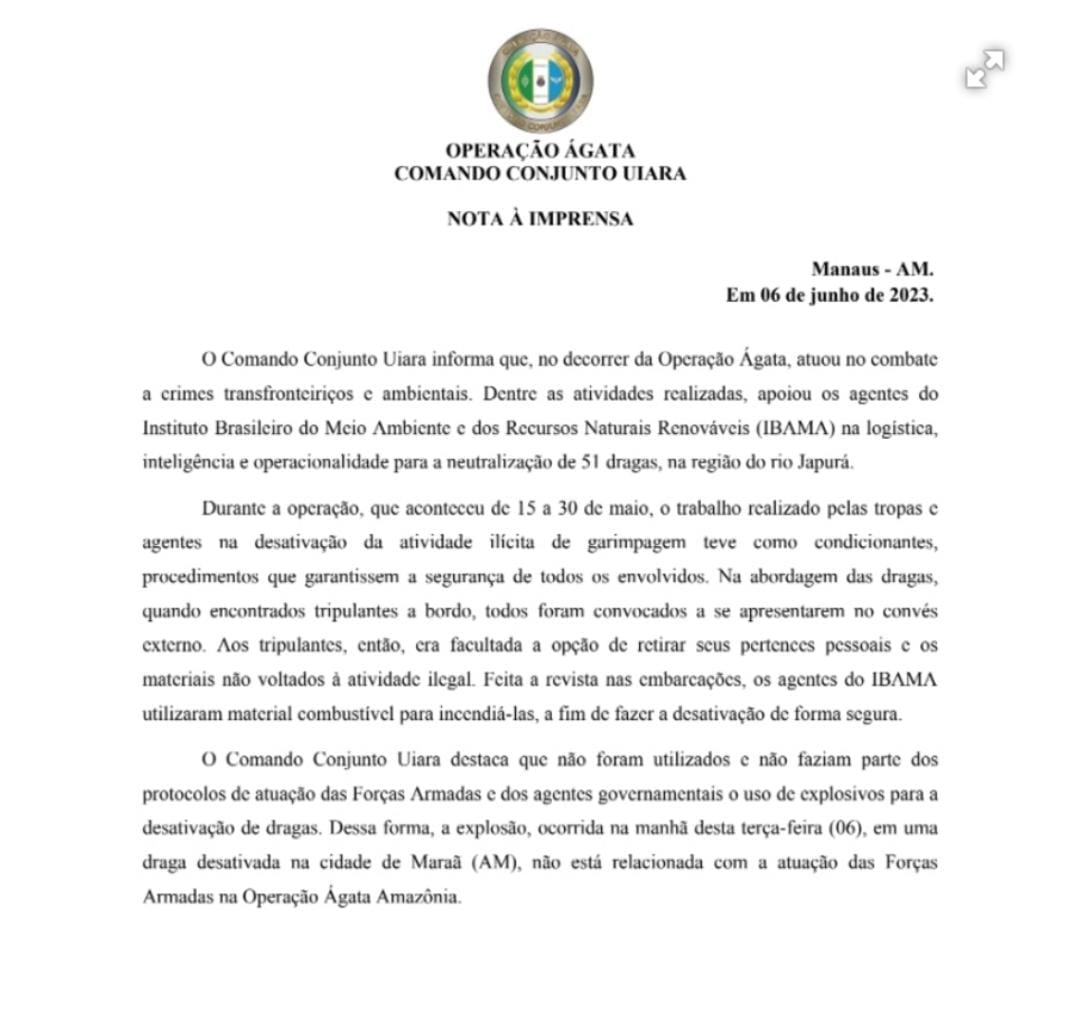 A nota diz que a operação na região de garimpo ilegal foi realizada nos dias 15 e 30 de maio e não teriam sido utilizados explosivos.