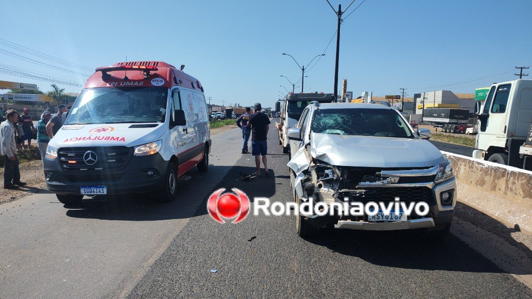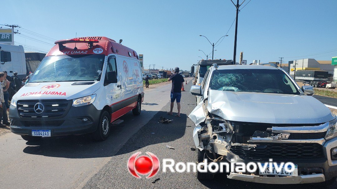 Na travessia irregular com a moto, o homem acabou atingido em cheio pela caminhonete modelo S10 que seguia em direção Candeias/Porto Velho.