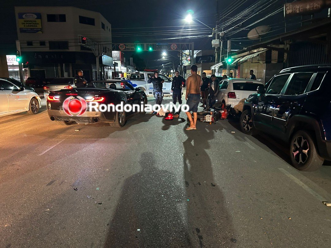 Um veículo modelo Camaro se envolveu em acidente de trânsito na noite desta sexta-feira (01) na Avenida Pinheiro Machado com Rua Marechal Deodoro, na região Central de Porto Velho (RO). Um casal de moto ficou ferido.