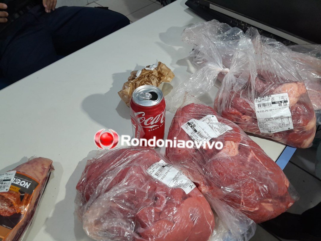 O homem com uma mochila de cor preta furtou uma peça de picanha, uma banda de peixe tambaqui, carne do tipo contrafilé, patinho e alcatra, totalizando sete quilos e o valor de R$ 296,00.