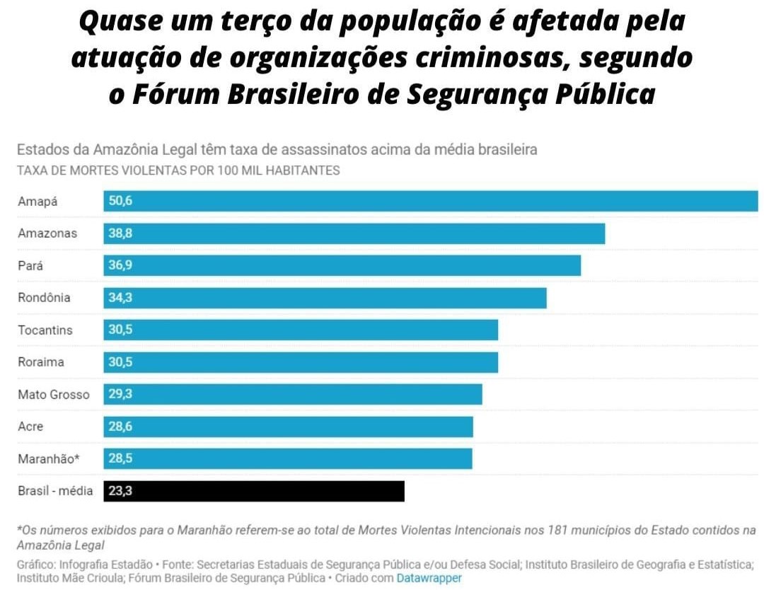 Em decorrência desse cenário, a taxa de mortes violentas intencionais (MVI) atingiu 33,8 por cada 100 mil habitantes no último ano, superando em 45% a média nacional. Essas disputas entre facções afetam aproximadamente um terço da população amazônica (31,1%), intensificando a sensação de insegurança entre os residentes.