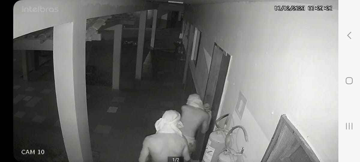 No vídeo é possível observar os três ladrões arrombando a porta de uma das salas da escola. Para não serem reconhecidos, os criminosos colocaram camisa na cabeça.