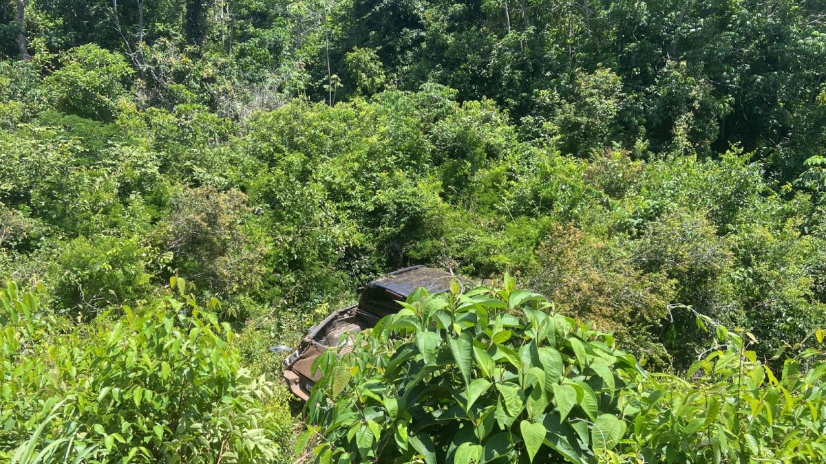 Uma caminhonete modelo S10 capotou em uma ribanceira após o motorista perder o controle da direção do veículo. Policiais penais que passavam pelo local prestaram apoio ao motorista.