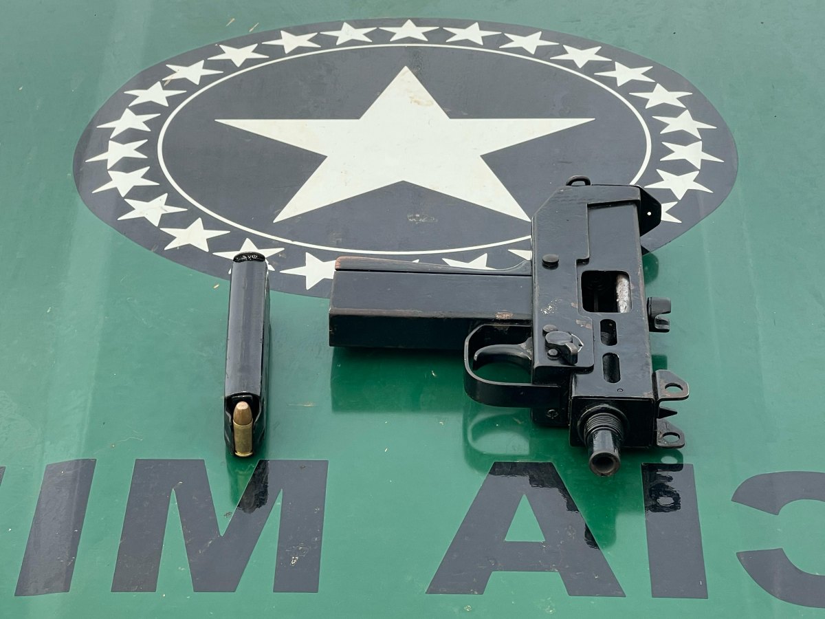No entanto, uma busca no veículo revelou uma metralhadora 9mm, imitação do modelo "UZI" israelense, com carregador e uma munição intacta, encontrada sobre a caixa de som.