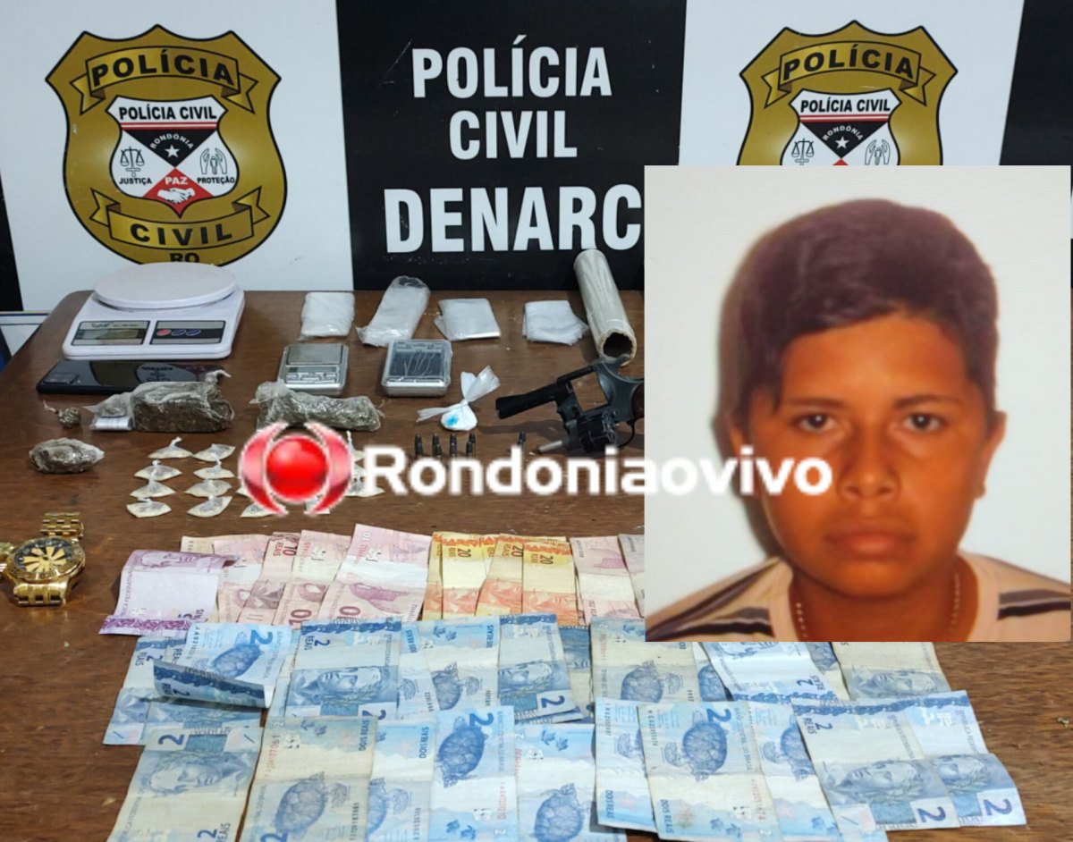 O traficante Caio foi interceptado e na residência os agentes do Denarc apreenderam várias porções de cocaína oxidada, tabletes de maconha, dinheiro trocado, revólver calibre 22, materiais usados para embalar entorpecentes, além de relógio e um cordão de procedência duvidosa.