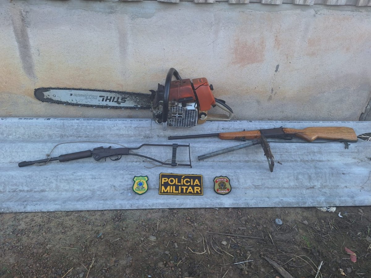 Foram apreendidas duas armas de fogo, munições, madeira extraída ilegalmente, uma motosserra e uma armadilha para caça
